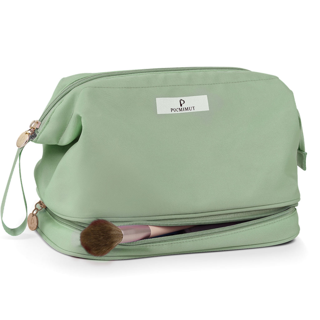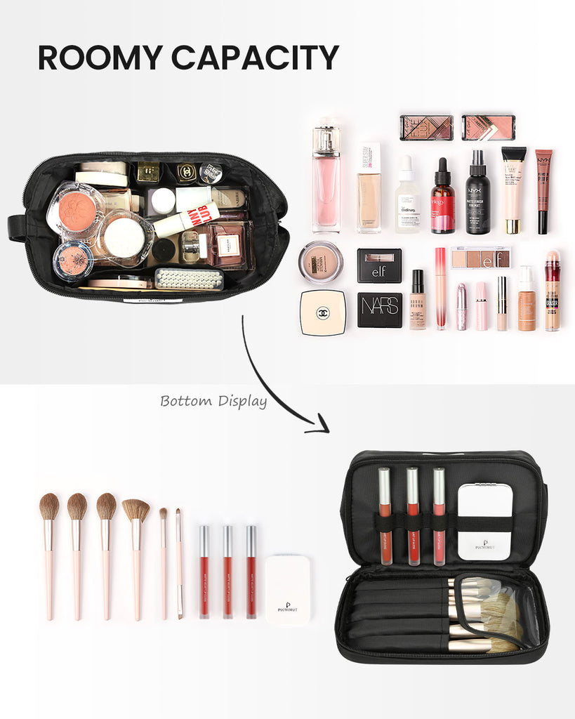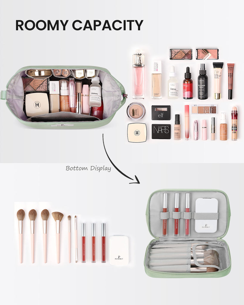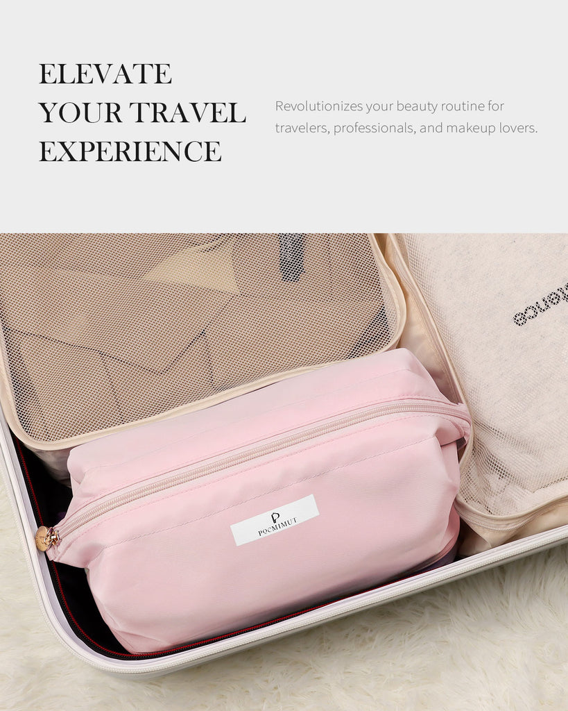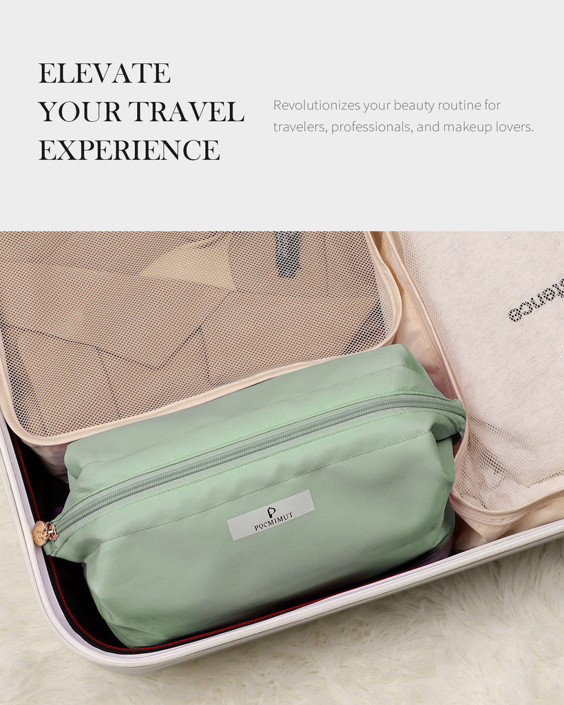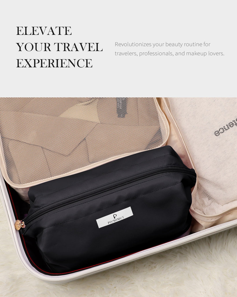 Get the perfect travel companion with our Pocmimut Makeup Bag! Featuring a high-quality, waterproof, and lightweight fabric, this 💼 has two layers, a cosmetic mirror, and two organizer pouches so you can bring more makeup ✨and keep your brushes 🖌clean. Each bag opens like a 🐢 and fits into a 🐌, so you can go wherever, whenever. 🤩