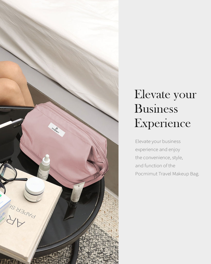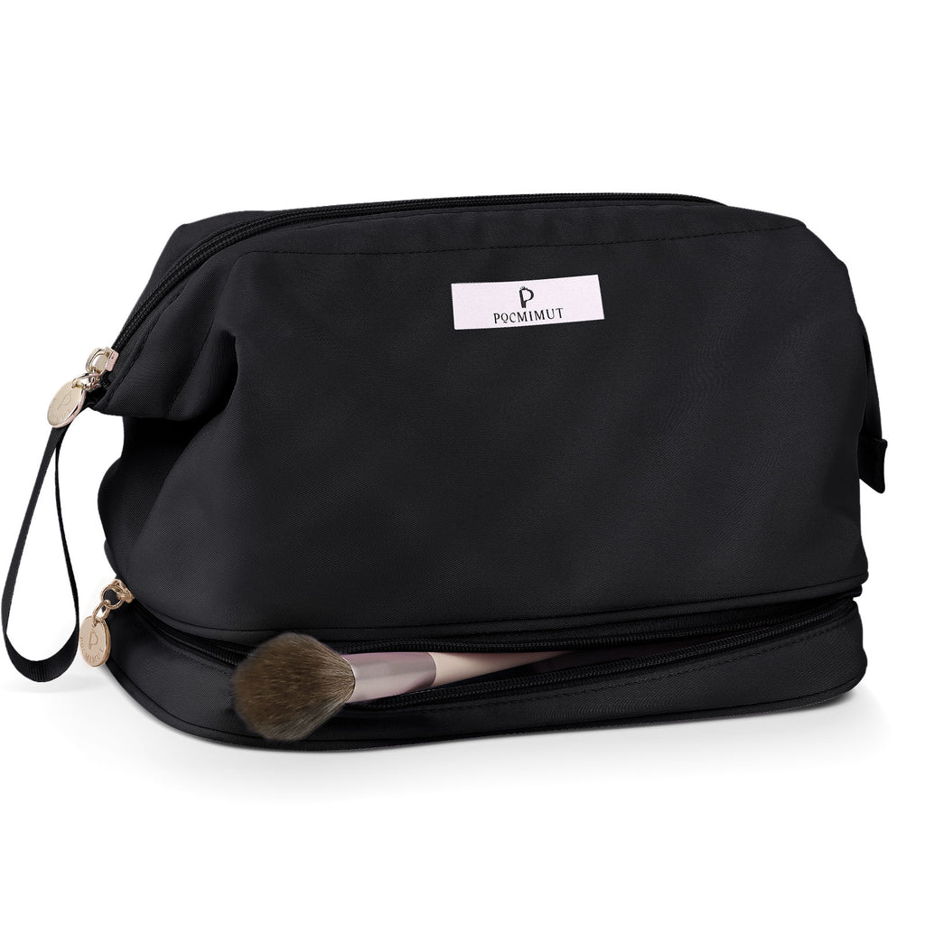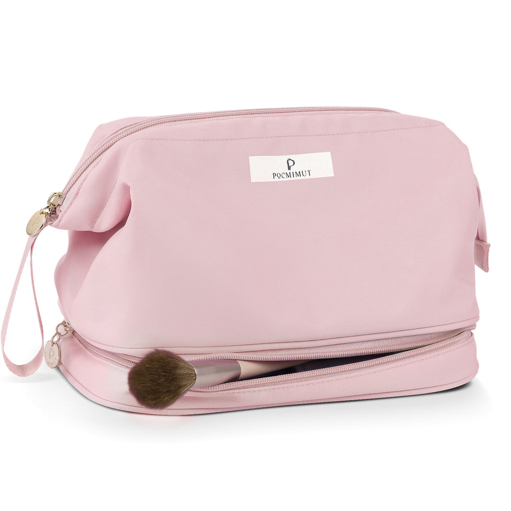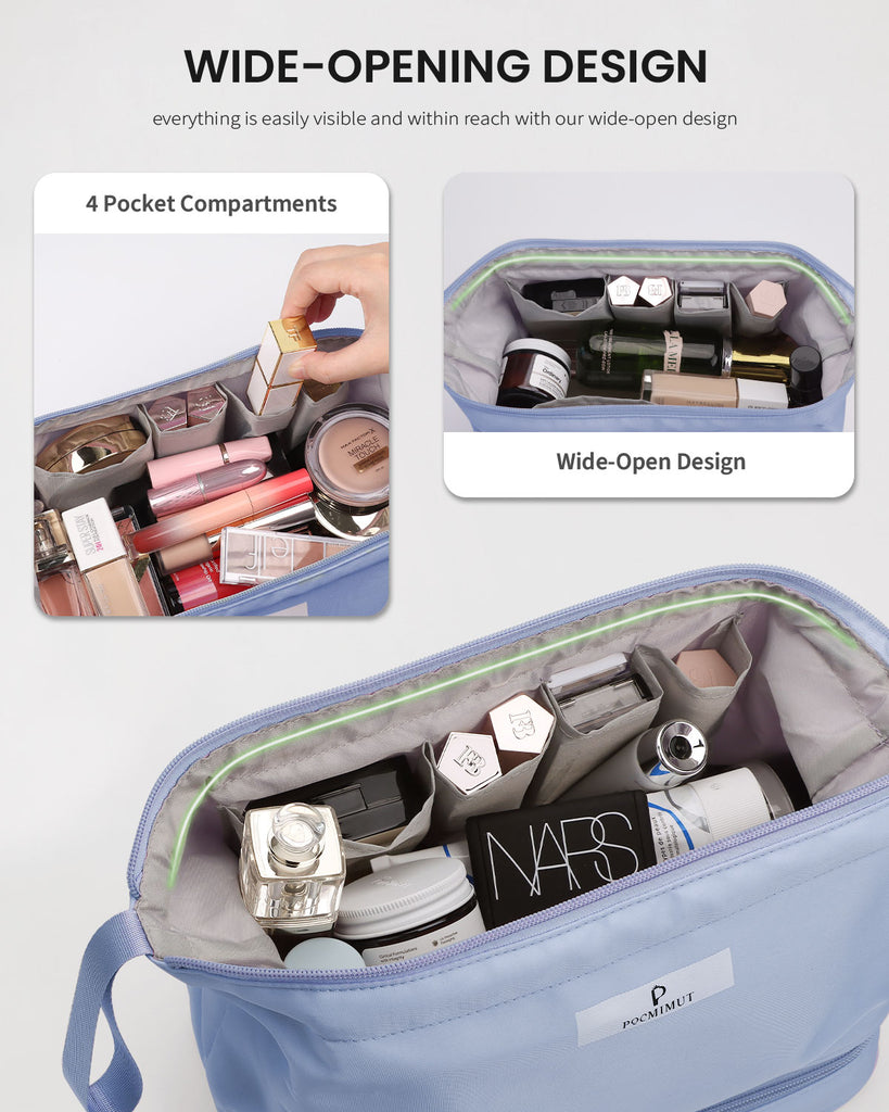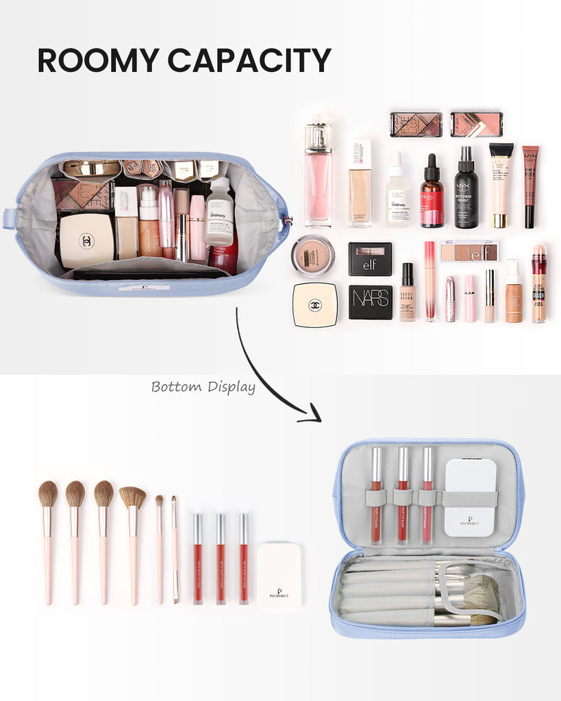 Get the perfect travel companion with our Pocmimut Makeup Bag! Featuring a high-quality, waterproof, and lightweight fabric, this 💼 has two layers, a cosmetic mirror, and two organizer pouches so you can bring more makeup ✨and keep your brushes 🖌clean. Each bag opens like a 🐢 and fits into a 🐌, so you can go wherever, whenever. 🤩