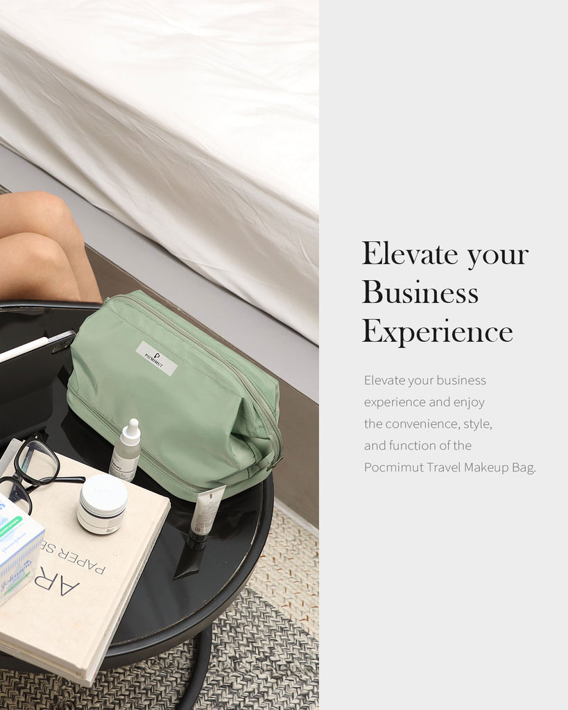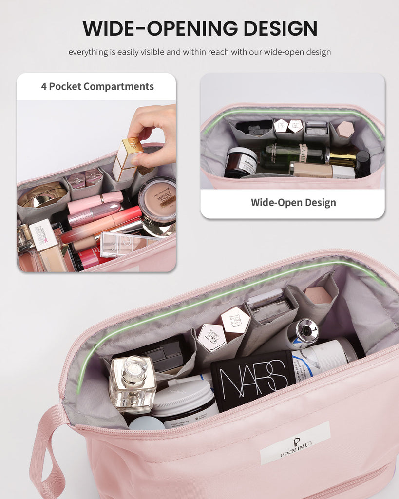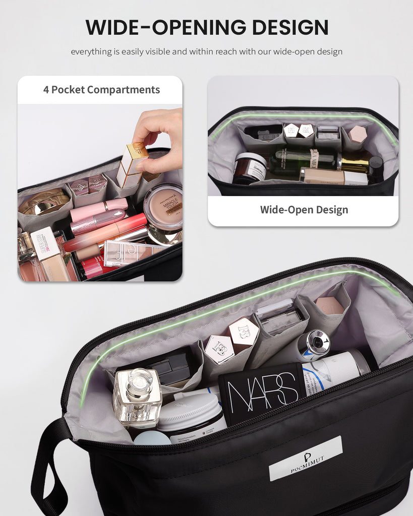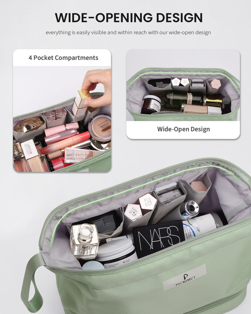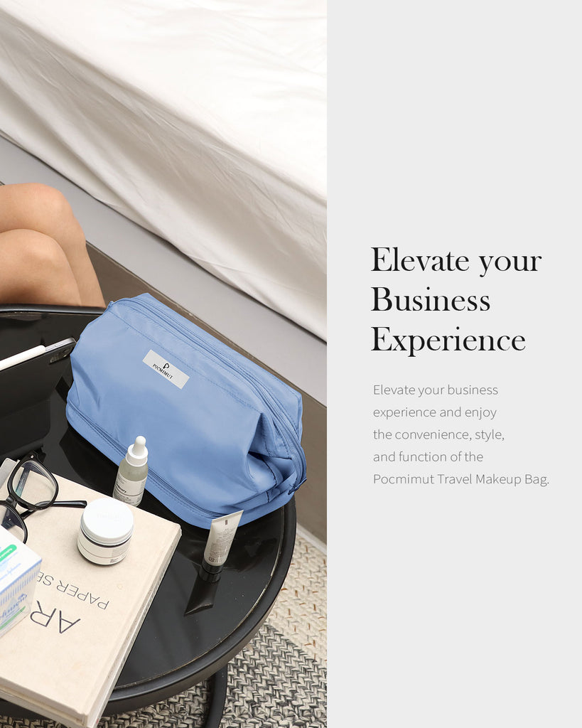 Get the perfect travel companion with our Pocmimut Makeup Bag! Featuring a high-quality, waterproof, and lightweight fabric, this 💼 has two layers, a cosmetic mirror, and two organizer pouches so you can bring more makeup ✨and keep your brushes 🖌clean. Each bag opens like a 🐢 and fits into a 🐌, so you can go wherever, whenever. 🤩
