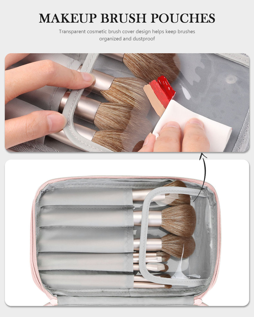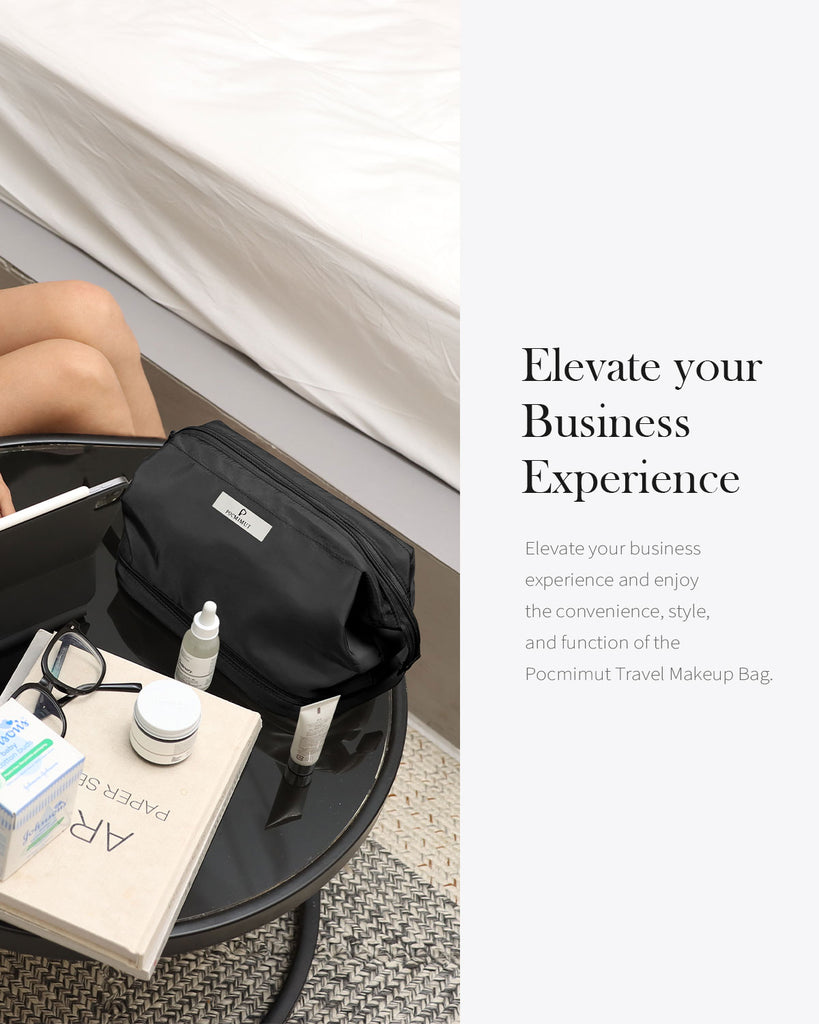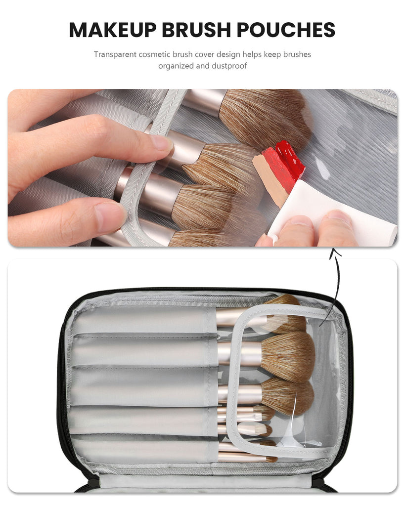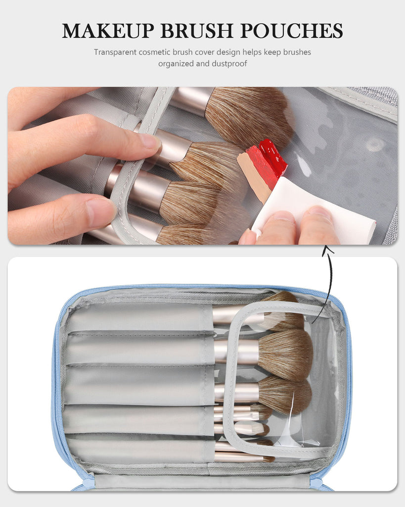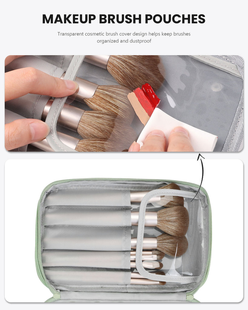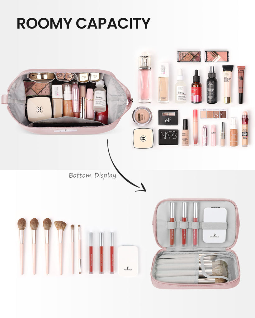 Get the perfect travel companion with our Pocmimut Makeup Bag! Featuring a high-quality, waterproof, and lightweight fabric, this 💼 has two layers, a cosmetic mirror, and two organizer pouches so you can bring more makeup ✨and keep your brushes 🖌clean. Each bag opens like a 🐢 and fits into a 🐌, so you can go wherever, whenever. 🤩