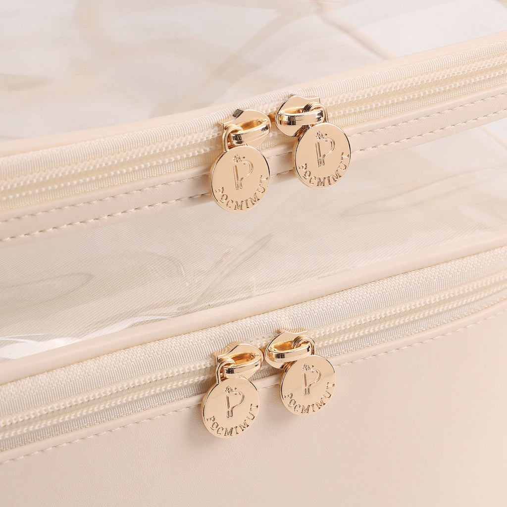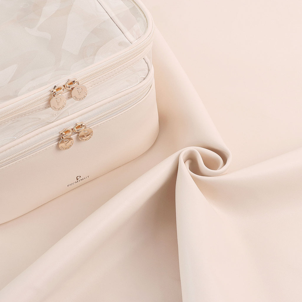 Say goodbye to smooshed makeup and overwhelmed suitcases! Our Pocmimut Large Capacity Transparent Square Cosmetic Bag is perfect for storing all your beauty must-haves. Made with vegan leather and eco-friendly PVC, this soft, durable, waterproof bag has a thick cushion to keep makeup perfectly protected. Plus, with 3 removable magic stick dividers, a detachable brush holder, and a waterproof pouch, you can easily organize your makeup and necessities with no fuss! At 10.24"*8.66"*7.48", this bag is roomy enough to store it all - and its transparent window lets you see every item with just a glance!
